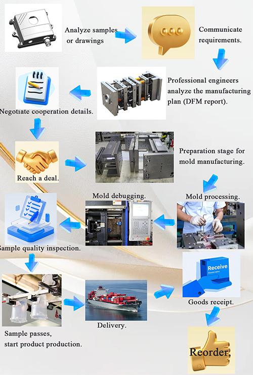 図面監査 - 金型流動解析 - 設計検証 - カスタム材料 - 金型加工 - コア加工 - 電極加工 - ランナーシステム加工 - 部品加工と調達 - 加工受入 - キャビティ表面処理工程 - 複合モード 金型 - 金型表面全体コーティング - 取付板 - 金型サンプル - サンプルテスト - サンプル送付 |